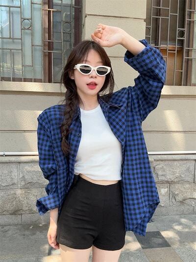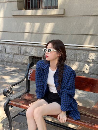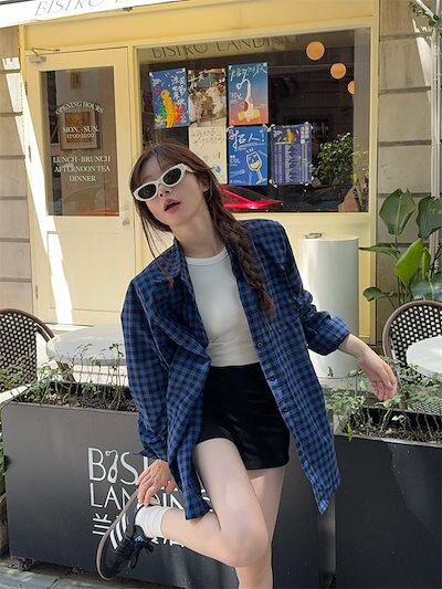 2024夏トップス シャツ 長袖 ボタン 襟 チェック柄 ゆったり 細見え 夏 青 ブルー おしゃれ かわいい 韓国ファッション レディース お出かけ