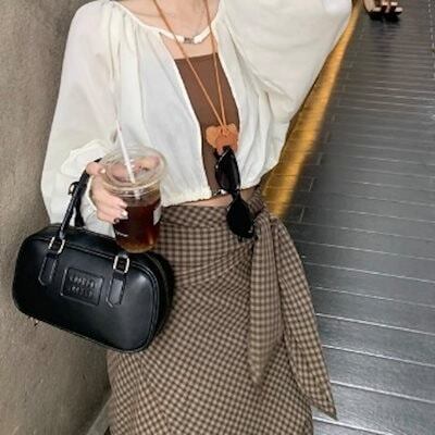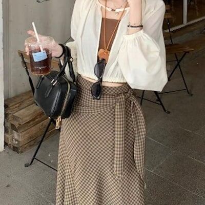 2024 春秋スカート ロング丈 Aライン チェック柄 リボン ハイウエスト 美脚効果 脚長効果 細見え 夏 茶色 ブラウン おしゃれ かわいい きれいめ 韓国ファッション レディース お出かけ | DOKO-ME