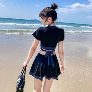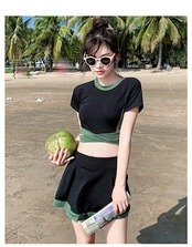 2024 2色 タンキニ ビキニ レディース 黒 バイカラー 体型カバー 水着 袖あり スカート スポーティー S M L XL 韓国 水着 上下セット セパレート カジュアル ミニスカート 半袖 T | DOKO-ME