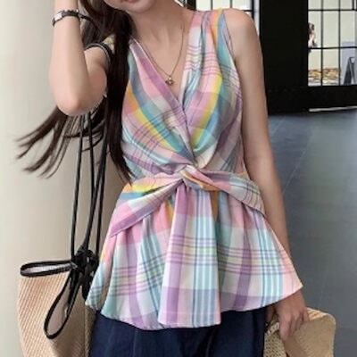 2024夏トップス ツイストシャツ Vネック チェック柄 ノースリーブ ゆったり 細見え 夏 カラフル ピンク おしゃれ かわいい キュート ガーリー 甘め 韓国ファッション レディース お出かけ | DOKO-ME