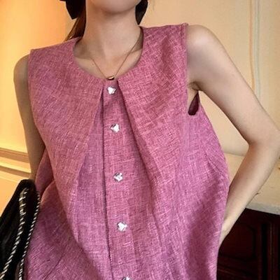 2024 夏 韓国トップス シャツ ラウンドネック ボタン ノースリーブ ゆったり 細見え 夏 ピンク おしゃれ かわいい 大人っぽい きれいめ 韓国ファッション レディース お出かけ | DOKO-ME