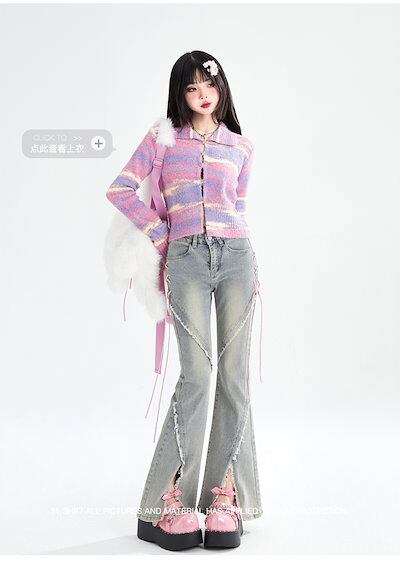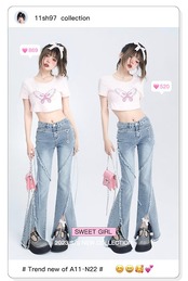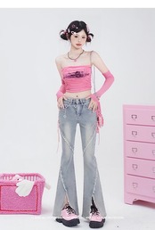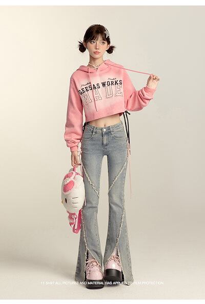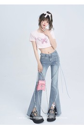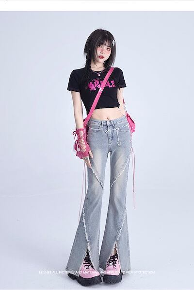 2024夏 韓国 デニムパンツ ボトムス ジーンズ ハイウエスト ファッション系ワイド スタイルサイド紐が付い ゆるダボ ジーンズ シルエット加工 レディース カジュアル メンズライク | DOKO-ME