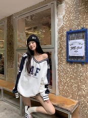 2024秋冬トップスバイカラー長袖TシャツかわいいK-POPレディース韓国風ロゴ衣装ルーズゆったりカジュアルおしゃれサイズ袖グラフィックシルエットファッション系サイドシャツフット春スポーツVネックT | DOKO-ME