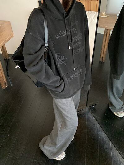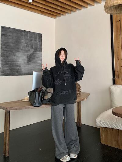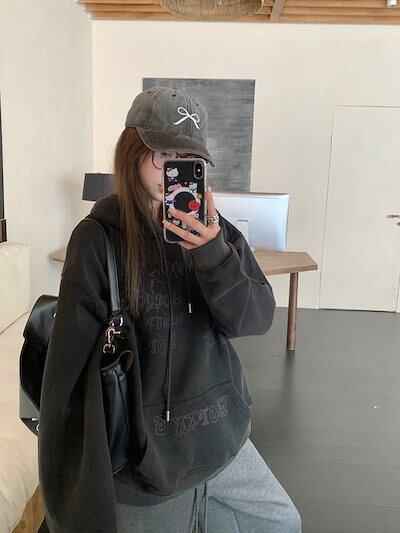 2024秋冬トップス 普段使い 韓国風長袖レトロパーカーカジュアルルーズファッション系ゆったり大人っぽかわいいレディースフード付き羽織りサイズきれいめシルエットトレーナー黑 大学生通学高校 | DOKO-ME