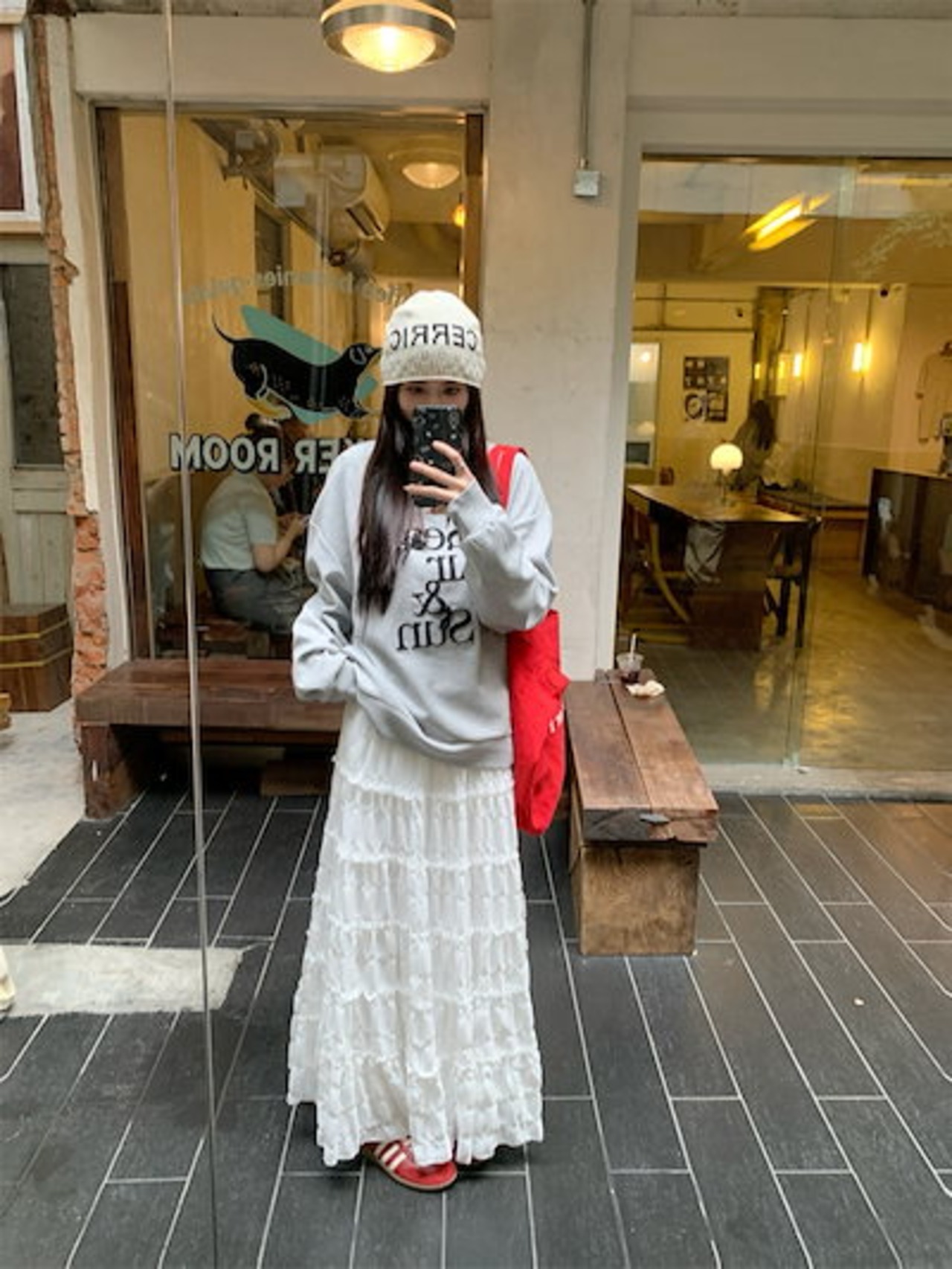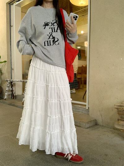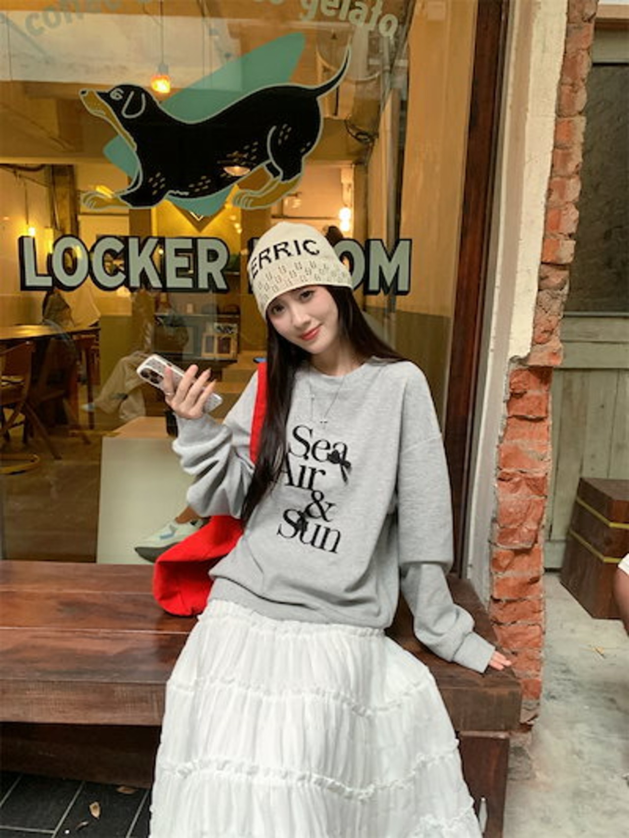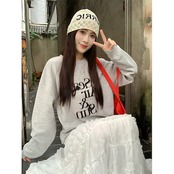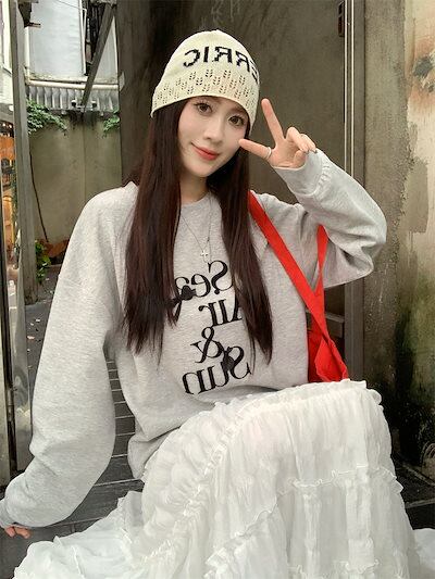 2024 秋冬 トレンド薄手トップス長袖かわいいK-POPTロング黑白レディース韓国風ロゴ衣装ルーズゆったりプリントおしゃれサイズスリーブシルエットファッション系サイドシャツフット | DOKO-ME