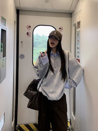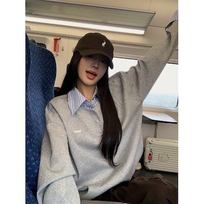 2024 秋冬 トレンド フェイクツーピース トップス長袖かわいいK-POPTロング黑白レディース韓国風ロゴ衣装ルーズゆったりプリントおしゃれサイズスリーブシルエットファッション系サイドシャツフット | DOKO-ME