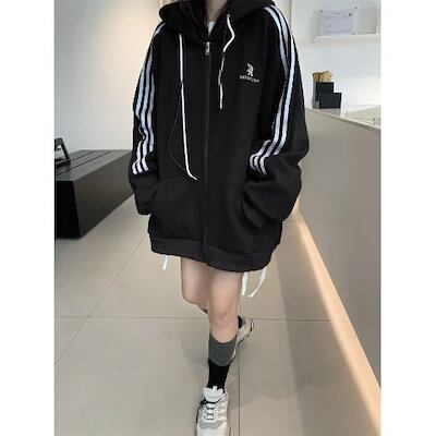 2024 秋冬トップス パーカー 裹起毛 2type フード付き チャック長袖ストライプゆったり細見え白黒おしゃれかわいいガーリーキュート 甘め 韓国ファッション レディースサイドお出かけトラック | DOKO-ME