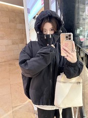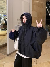 ふっくら中綿 あたたかい 冬 防寒あったかショート暖かいかわいいフード付きブルゾン厚手アウターブルーBF風 無地羽織るファッション大人ゆったりカジュアルストリートネックにサイズゆるダボシルエット秋黑白 | DOKO-ME