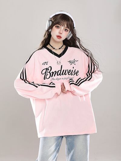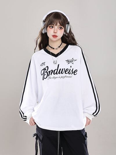 2024 秋冬 トレンドVネックトップスバイカラー長袖 かわいいK-POPTロング黑白レディース韓国風ロゴ衣装ルーズゆったりカジュアルおしゃれサイズスリーブシルエットファッション系サイドシャツフット春 | DOKO-ME