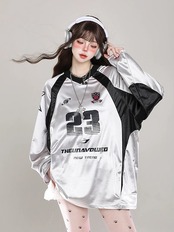 2024 秋冬 トレンドトップスバイカラー23長袖 かわいいTシャツレディース韓国風ロゴ衣装ルーズゆったりカジュアルおしゃれサイズスリーブVネックシルエットファッション系ロングサイドシャツK-POP春 | DOKO-ME