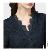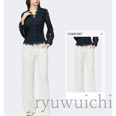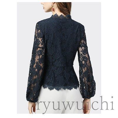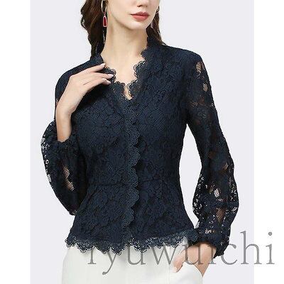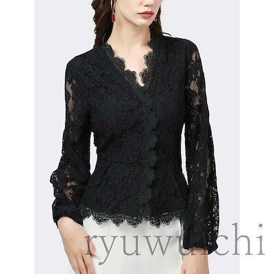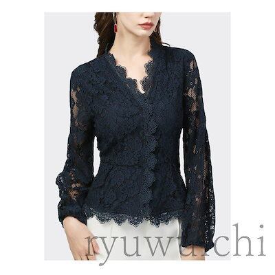 ブラウス レディース トップス レース Vネック 長袖 透け感 花柄 エレガント 大人スタイル ネイビー ブラック ホワイト お洒落 シンプル レディース