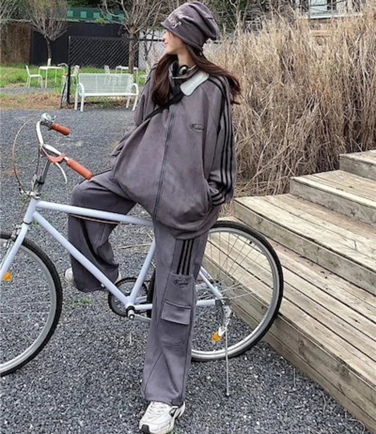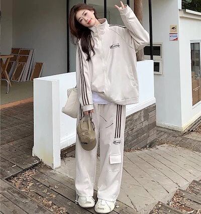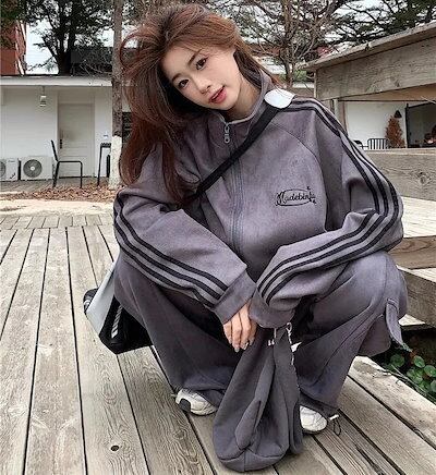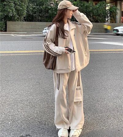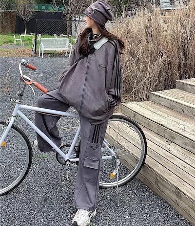2色 パーカー 長袖 スウェット ファスナー トップス ジャケット + スウェットパンツ カーゴパンツ ジョガーパンツ 上下セット レディース 春 秋 ダンス 通学 スポーツウエア 運動着 | DOKO-ME