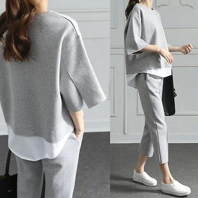 フェイクレイヤード セット日韓 涼しく楽ちんセットアップ 新作 2024 セット 二点セット 運動 春