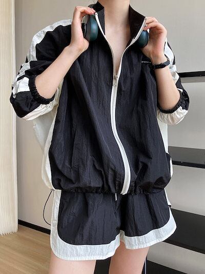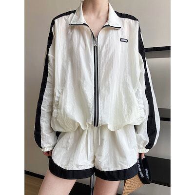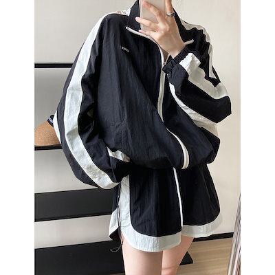 セットアップ レディース 上下セット 2点セット アウター ボトムス ジャケット パンツ 長袖 ショート 夏 レディース スポーツ カジュアル ワイドレッグ ジッパー 2色展開