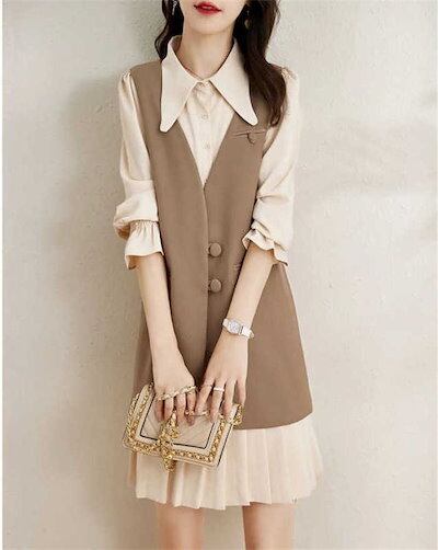 セットアップ ワンピース ベスト レディース 長袖 2点セット トップス ロング プルオーバー 無地 秋 春 秋服 Aライン aライン 通勤 OL オフィス ビジネス エレガント フォーマル 大人 お | DOKO-ME