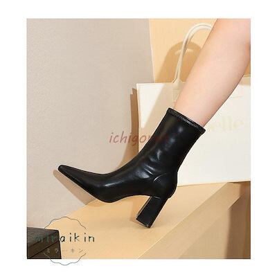 【3日以内出荷】ブーツ レディース ショートブーツ 履きやすい 痛くない 8cmヒール 22-26.5cm 太めヒール 裏起毛タイプあり 黒 ブラック 歩きやすい 通勤用 仕事 美脚パンプス | DOKO-ME