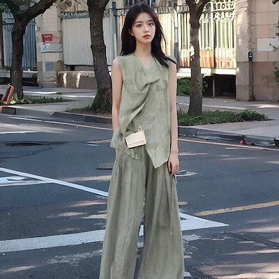 2024 夏 涼しく楽ちんセットアップ スーツ 人气新作 レトロなノースリーブベスト トップス+ワイドパンツ 2点セット レディース 韓国ファッション
