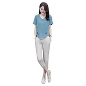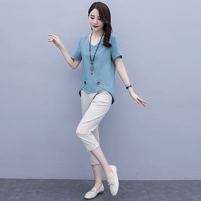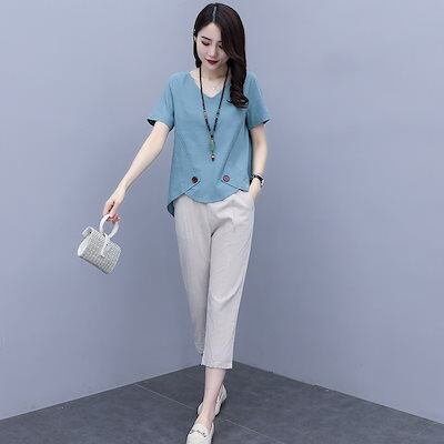 涼しく楽ちんセットアップ レディース 夏 韓国 半袖 2024夏の新作Tシャツ2枚セット綿麻のカジュアルパンツスーツ女性 ルームウェア セットアップ スウェット上下セット スーツ