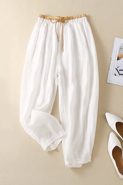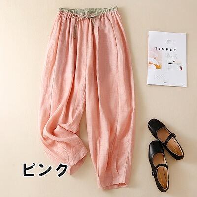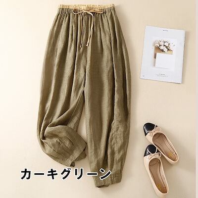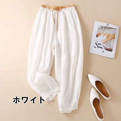 ボトムス パンツ レディース ズボン ワイドパンツ サルエルパンツ リネンライク パンツ 9分丈 ウエストリボン 無地 刺繍 ワイド ハイウエスト レトロ ウエストゴム 体型カバー 大きいサイズ | DOKO-ME
