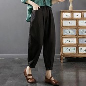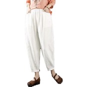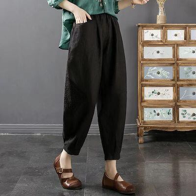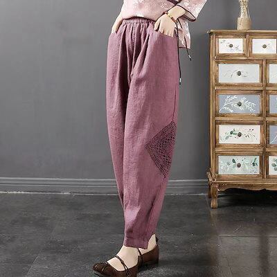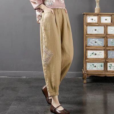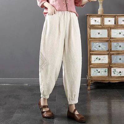 ボトムス パンツ レディース ズボン ワイドパンツ サルエルパンツ リネンパンツ 9分丈 リネン コットン 無地 刺繍 ワイド ハイウエスト レトロ ウエストゴム 体型カバー 大きいサイズ ホワイト | DOKO-ME