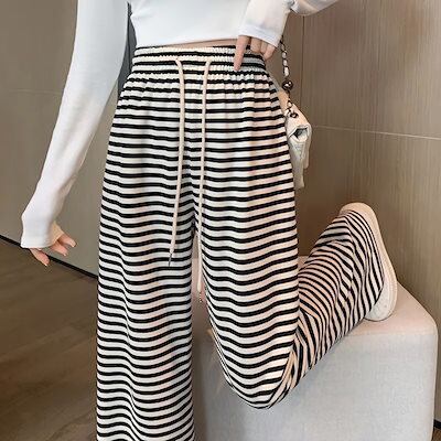 大きいサイズの白黒のストライプのズボンの子供の夏の高腰の垂感の狭い版の広腿のズボンのカジュアルなモップのズボン