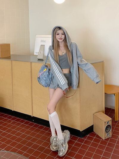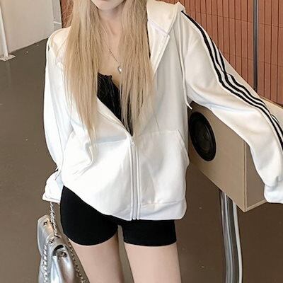 2024 秋トップス パーカー フード付き チャック 長袖 ストライプ ゆったり 細見え 秋 白 黒 おしゃれ かわいい ガーリー キュート 甘め 韓国ファッション レディース お出かけトラック | DOKO-ME