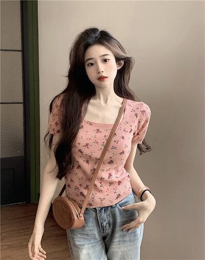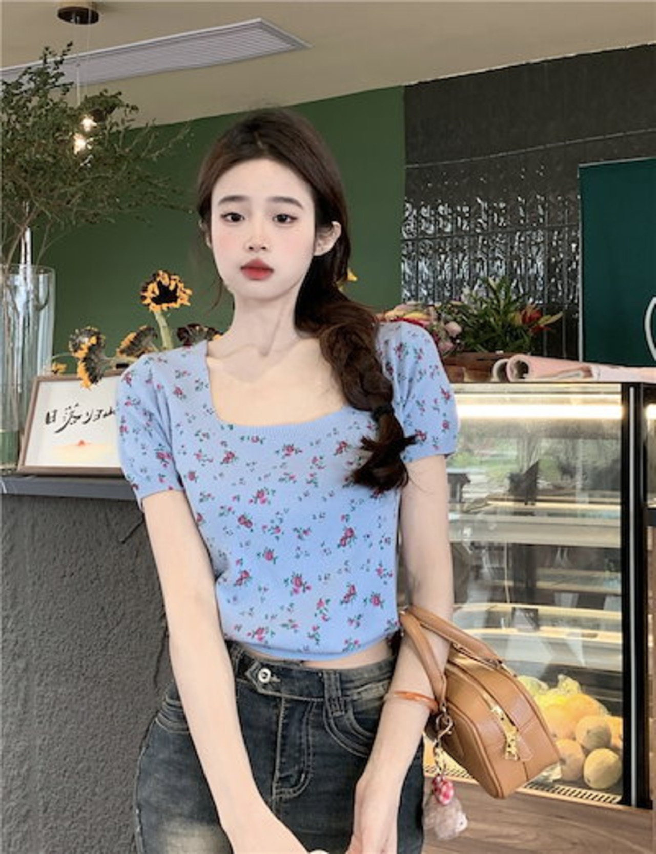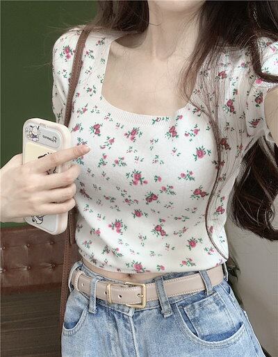 2024 夏 韓国トップス Tシャツ 半袖 スクエアネック 花柄 丈短め ショート スリム 夏 白 青 かわいい おしゃれ ガーリー キュート 甘め カジュアル 韓国ファッション レディース お出かけ | DOKO-ME