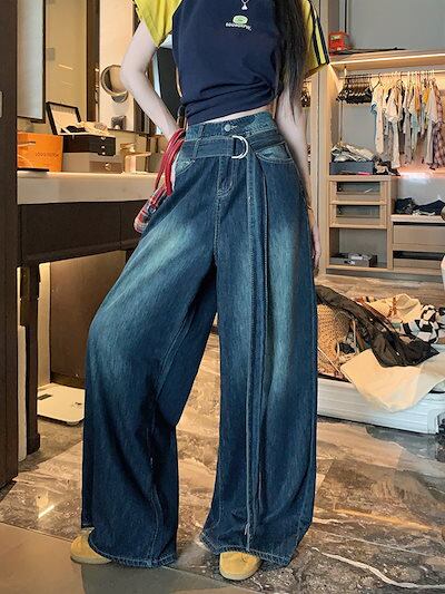2024夏 韓国パンツ デニム ジーンズ ロング丈 ワイドレッグ ウォッシュ加工 ベルト ハイウエスト 美脚効果 脚長効果 細見え 夏 白 青 おしゃれ かわいい 韓国ファッション レディース お出か