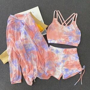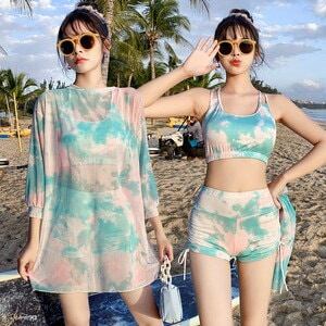 2色 タンキニ 水着 レディース 3点セット Tシャツ ラッシュガード カジュアル タイダイ シャーリング スポーティー 体型カバー 水着 セパレート 上下セット ビキニ ショートパンツ ピンク グリ