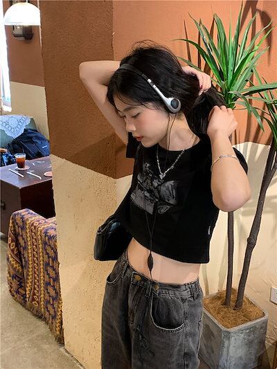 2024 春夏 甘い トップス Tシャツ ラウンドネック 休日 ファッション スリムフィット丈短め ショートサイズスリーブ レディース へそ出しシルエット 韓国 休日 おしゃれ T
