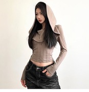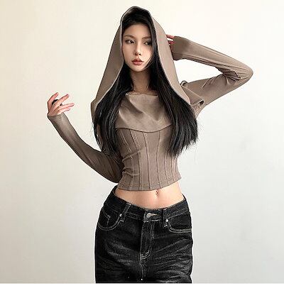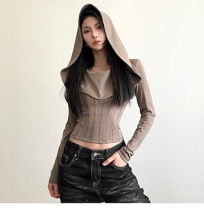 2024 春秋 フード付き tシャツ ファッション トップス 薄手 韓国系コーデ 重ね着風 長袖 切替 ソリッドカラー衣装シャツスリムトップパイル襟シャツ肌見せ女っぽフレンチタイト丈 レディース T | DOKO-ME