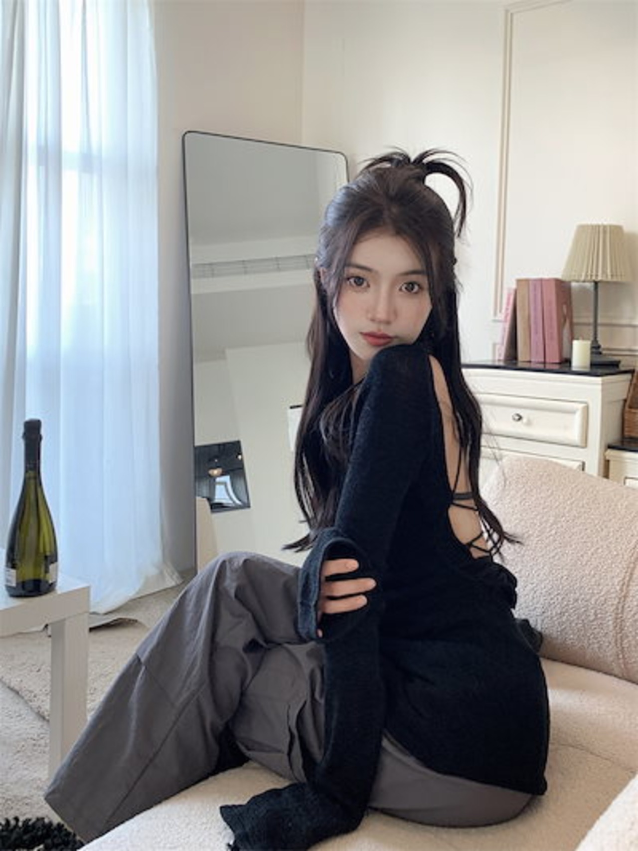 2024春秋 ニットトップス 2点セット レディースレースアップ長袖 韓国系ファッション 可愛い ニット プルオーバー セクシー ニット ショート丈トップスおしゃれ 薄手透け感 クロシェ | DOKO-ME