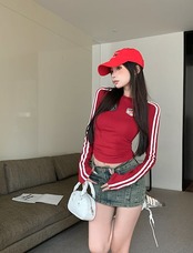 2024秋 長袖 Tシャツ ショート丈 カットソーワッペンK-POPトップス カジュアル 配色韓国系ストリートへそ出しタイトネックスリーブ 肌見せ T ファッションレディースかわいいサイド衣装風冬 | DOKO-ME