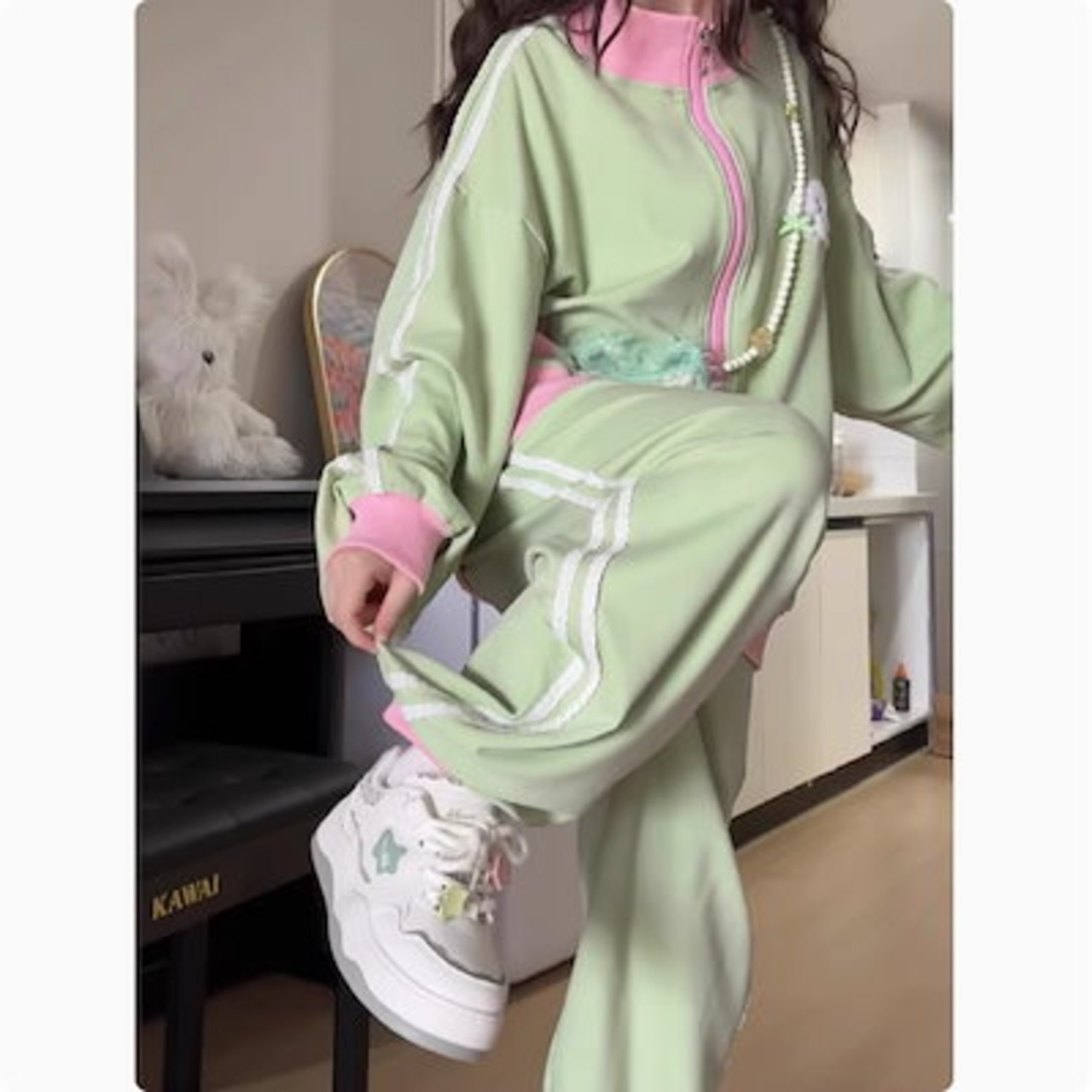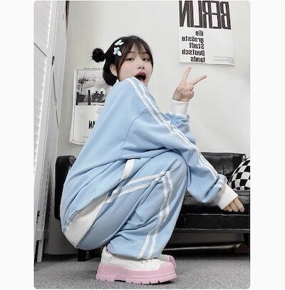 2024 春秋 2点セット 韓国トップス お出かけ 羽織り ショート丈 レディース上下セットフルラウンドヘム ルーズサイドボトムススポーツミックス系冬ゆったりサイズワイドシルエットリラックストラック | DOKO-ME