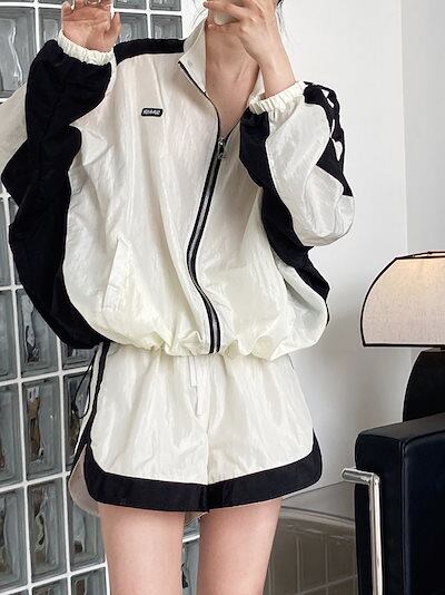 セットアップ レディース 上下セット 2点セット アウター ボトムス ジャケット パンツ 長袖 ショート 夏 レディース スポーツ カジュアル ワイドレッグ ジッパー 2色展開