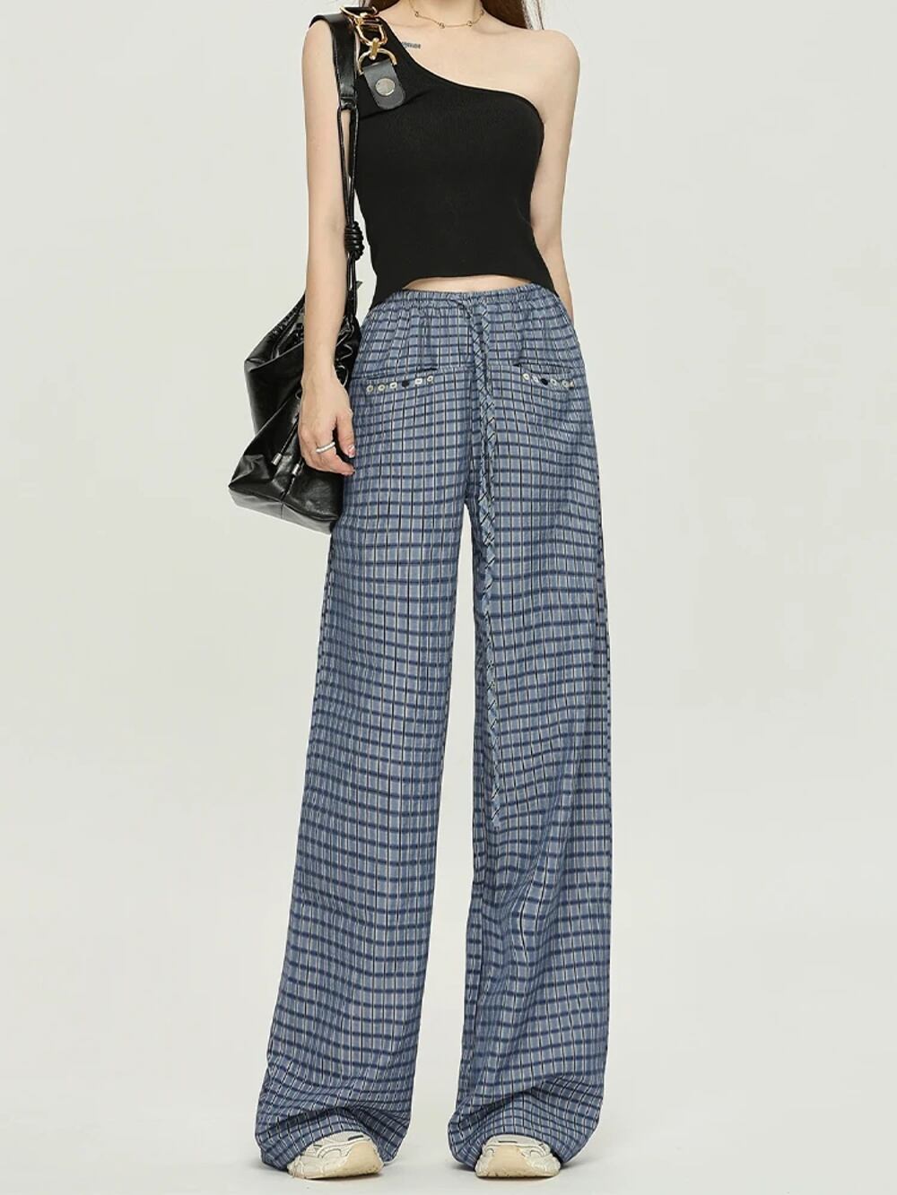 レディースヴィンテージチェックバギーパンツ,原宿ストリートウェア,エステティックパンツ,ハイウエストパンツ,ファッションウェア,y2k,2000s y2k ボトムス T240901102906_01 | DOKO-ME