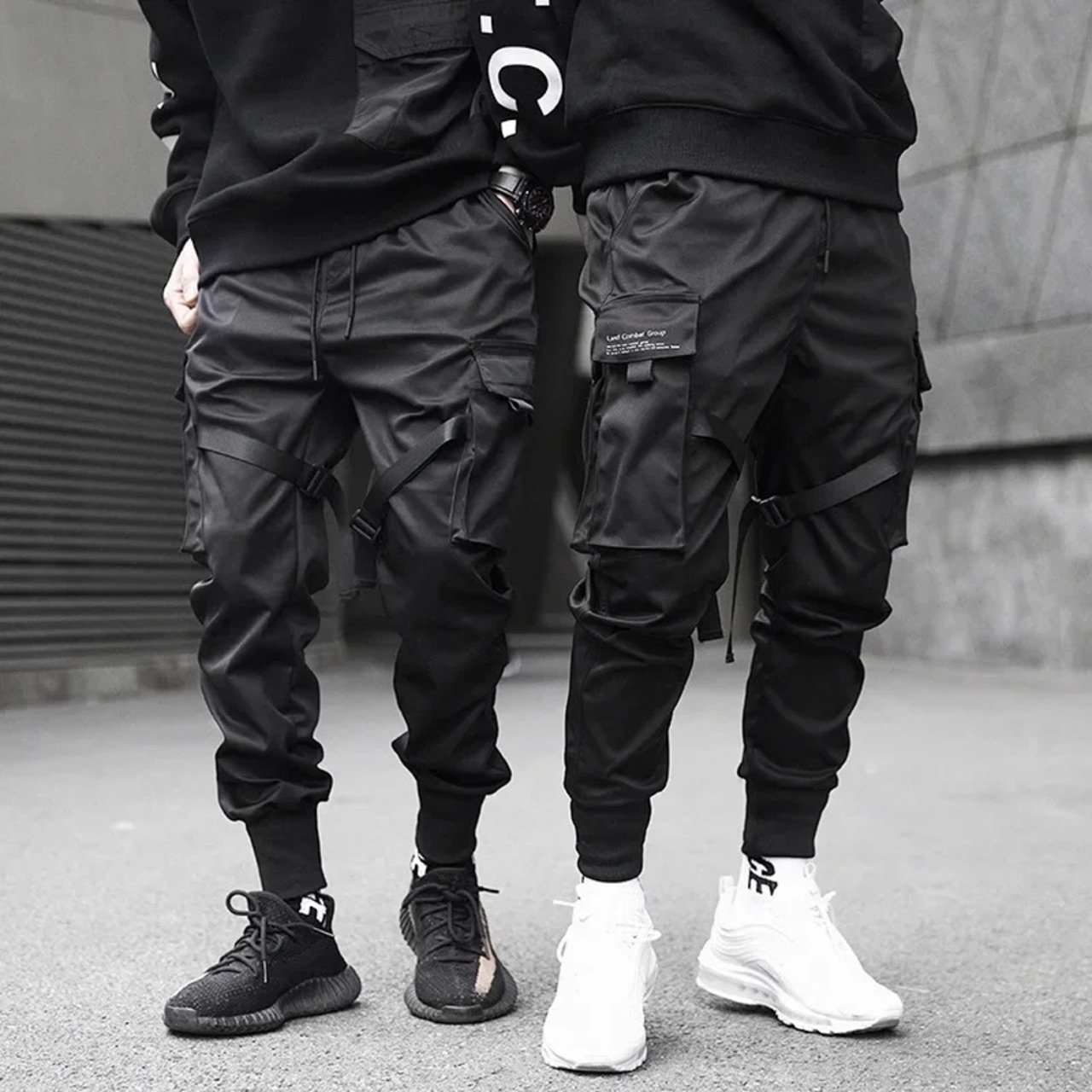 男性用ルーズフィットカーゴパンツ、黒忍者隠し戦士、カジュアルタクティカルパラトルーパー、シルエットを滑らかにし、トレンディ y2k ボトムス T240901103455_01