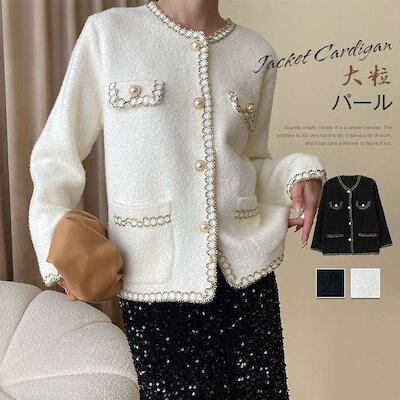 カーディガン ボレロ レディース 長袖 ノーカラー ニット パールボタン ジャケット アウター ノーカラージャケット ツイードカーディガン 春 秋 冬 ショート丈 丸首 無地 生地 きれいめ ツイード | DOKO-ME