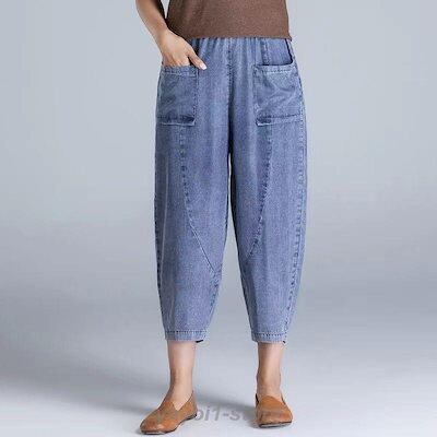 サルエルパンツ レディース デニム クロップドパンツ テーパード アメカジ ズボン ウェストゴム ゆったり 大きい 体型カバー リラックス ボトムス 春 夏 秋コー