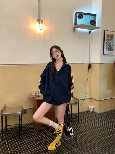 2024 秋冬トップス チャック 長袖 細見え 秋 黄色 イエロー ネイビー おしゃれ かわいい シルエットカジュアルサイド 韓国系 ファッションサイズレディース お出かけトラック | DOKO-ME