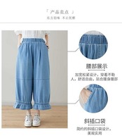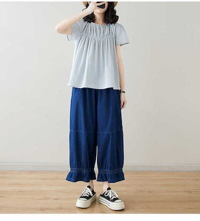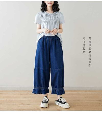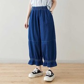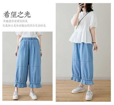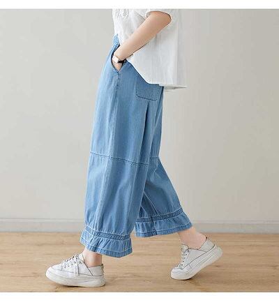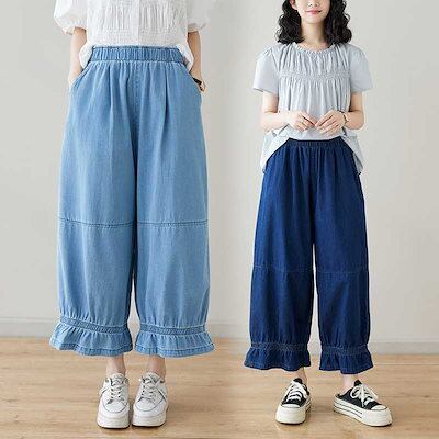 「ファットガール」 九分丈 デニムパンツ ワイドパンツ ジーンズ フリル フレア 夏 ゴム 体型カバー 大きいサイズ ゆったり レディース