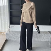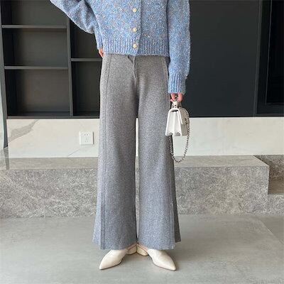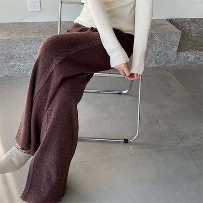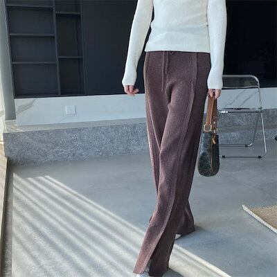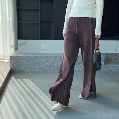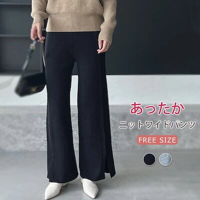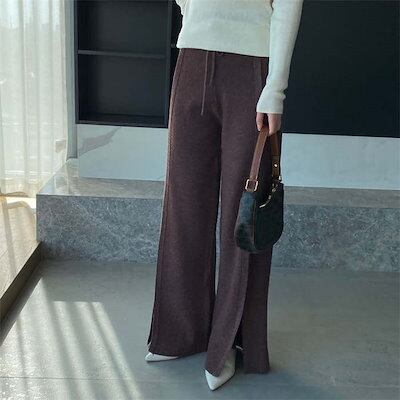 パンツ ニットパンツ 春 秋 冬 無地 ロング丈 イージーパンツ スリットパンツ ボトムス レディース スリット ワイドパンツ フレアパンツ ウエストゴム リラックス レイヤード ロングパンツ ゆるパ | DOKO-ME