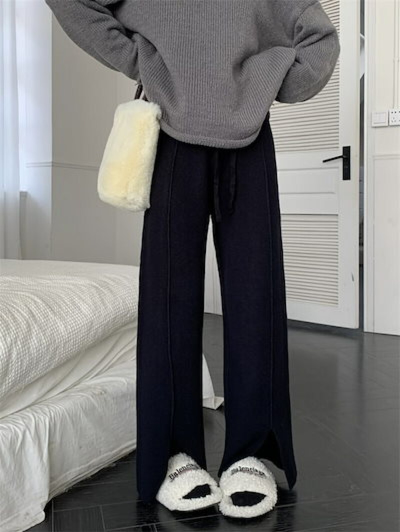 ニットパンツ ワイドパンツ レディース 春 秋 冬 フロントスリット ガウチョパンツ ウエストゴム ニット ゆるパンツ ストレートパンツ リラックス ゆったり 楽ちん ロングパンツ フレアパンツ 美脚 | DOKO-ME