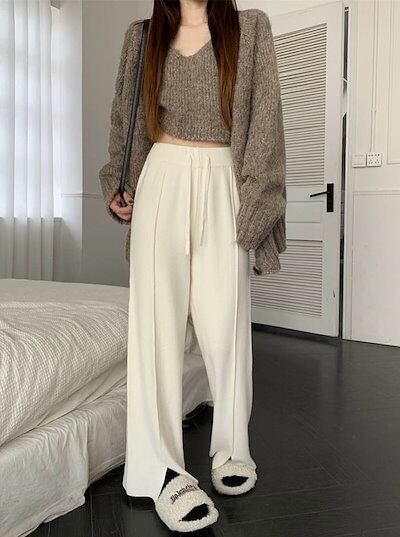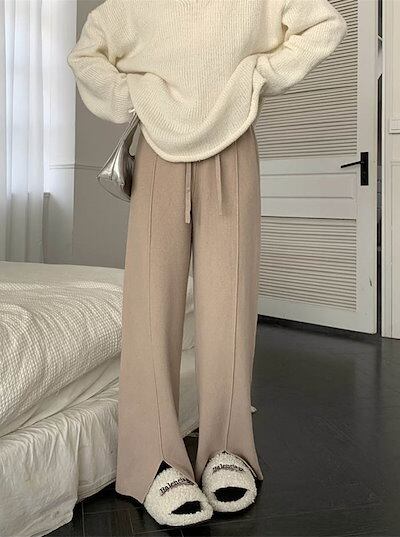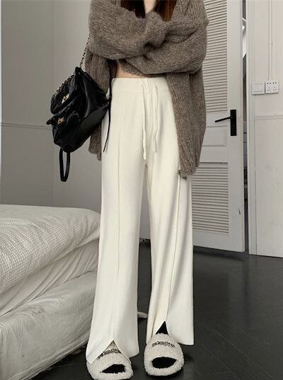 ワイドパンツ ニットパンツ レディース スリットパンツ イージーパンツ スリット入り フレアパンツ ストレッチ ウエストゴム ボトムス 美脚 無地 ロングパンツ ボトム ズボン 春 秋 冬 カジュアル | DOKO-ME