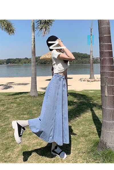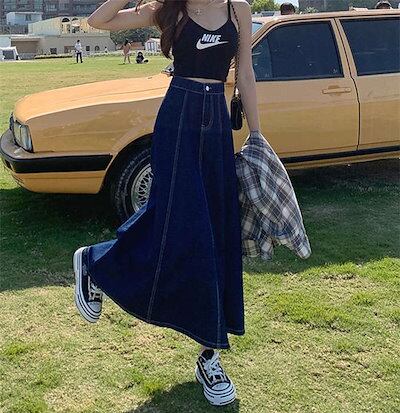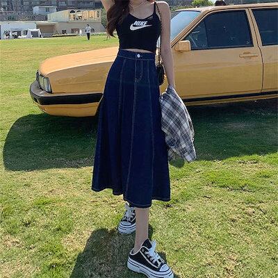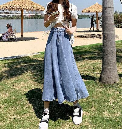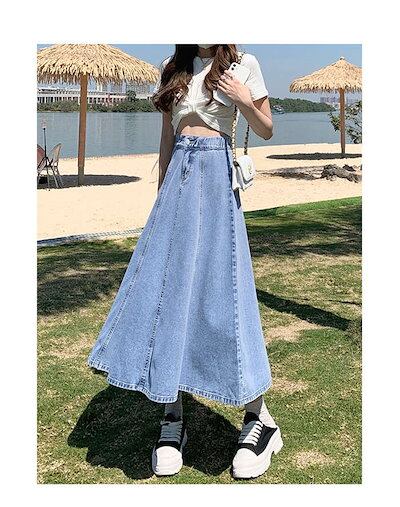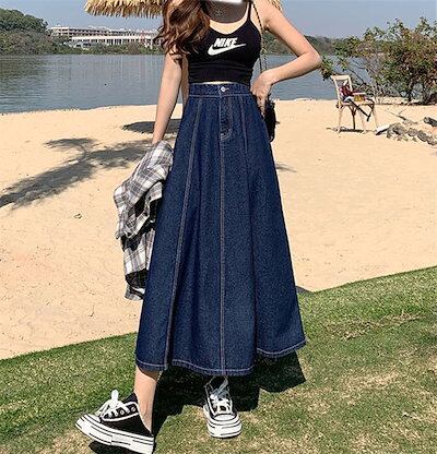 スカート ロング デニム レディース 春 デニムパンツ Aライン フレア ゆったり ボトムス バック ウエストゴム 無地 着痩せ 美脚 通勤 シンプル カジュアル きれいめ お洒落 体型カバー 2 | DOKO-ME