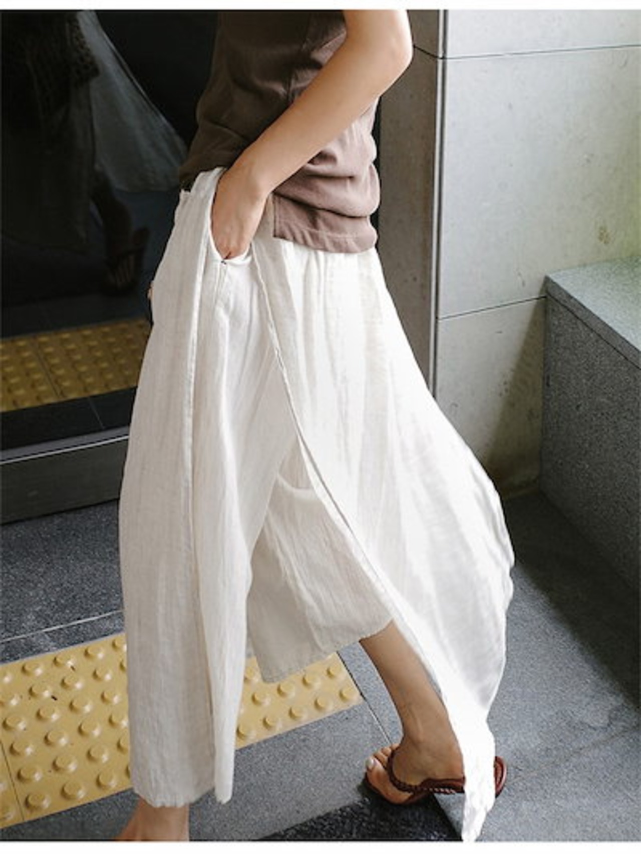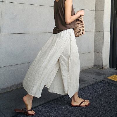綿麻ワイドパンツ リネン スカート レディース 夏 ガウチョパンツ フレアパンツ スカート見えるパンツ 綿麻風 ウエストゴム バギーパンツ 大きいサイズ ゆったり リラックス ビーチ 海 爽やか ふん | DOKO-ME