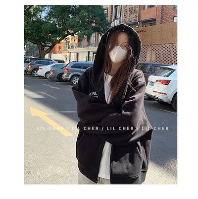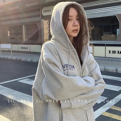 グレーのファスナーカーディガンハットパーカーレディース春カジュアルファッションゆったり気だるい風前後プリントコート