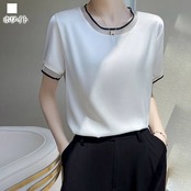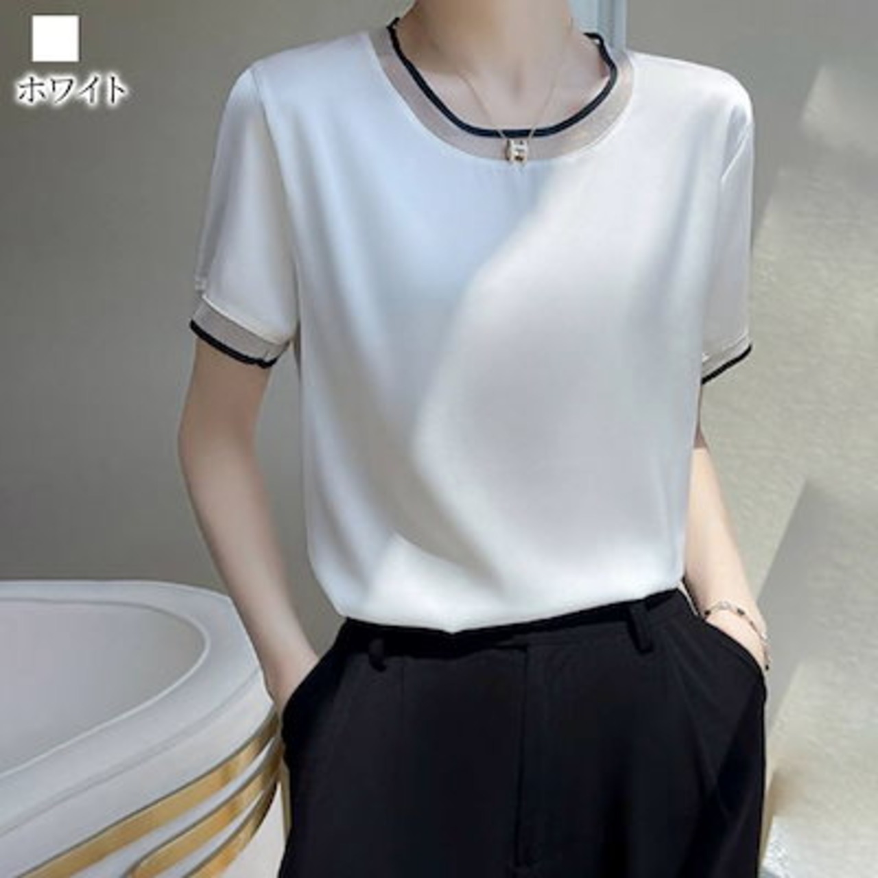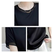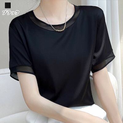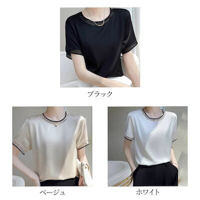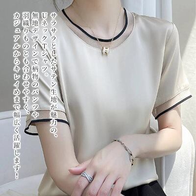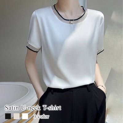 Tシャツ レディース サテンUネックTシャツ ブラウス 5分袖 春 スポーツ ゆったり ブラック 40代 ロゴ カジュアル 7分袖 薄手 Vネック かわいい ティーシャツ 大人 人気 涼しい シャツ | DOKO-ME