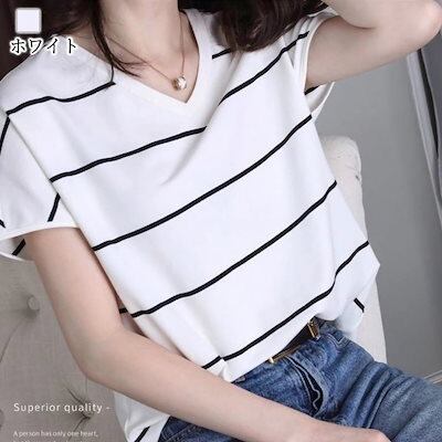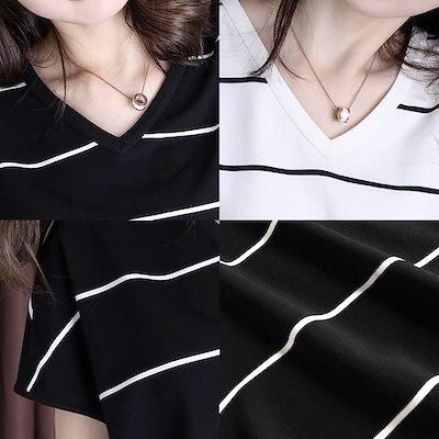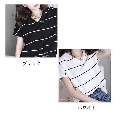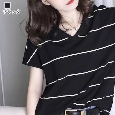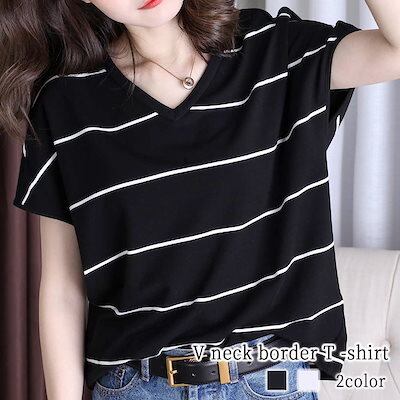 Tシャツ レディース VネックボーダーTシャツ 夏 ブラウス 40代 ティーシャツ ジム ゆったり スポーツ ブランド 人気 かわいい 涼しい 大人 カジュアル ブラック ロゴ おしゃれ 春 5分袖 | DOKO-ME
