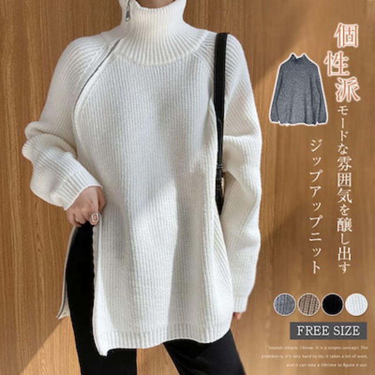 変形ジップアップニット ニット セーター レディース 秋冬 トップス 長袖 セーター リブニット リブ ハイネック ジップアップ アシンメトリー 変形 レイヤード 無地 モード系 個性的 大人 ビッグ | DOKO-ME